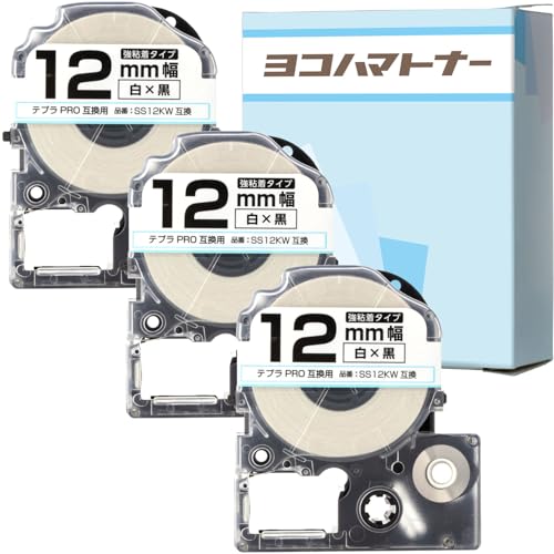 【テープ】テプラ テープ 12mm 白 SS12K の互換品、3個セット。幅12mm、長さ8m,色: 白地に黒の文字。